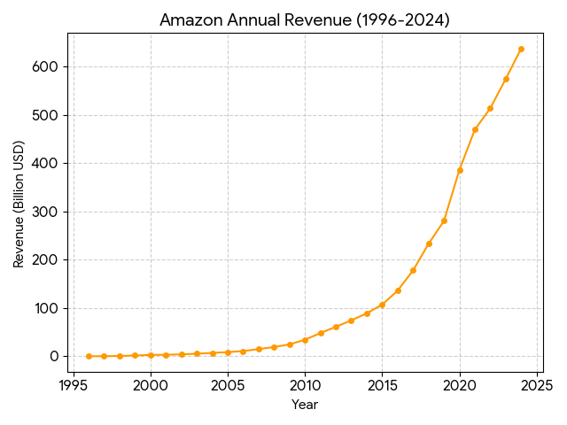 2024-2025: Focused on the deep integration of Generative AI (such as Amazon Bedrock) with AWS and continued expanding its proprietary logistics fleet. Revenue reached 637.96 billion USD in 2024.