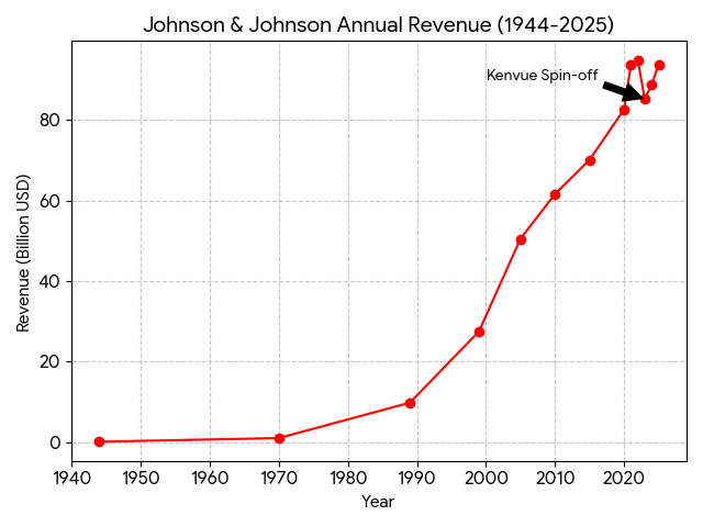 - Post-Spin-off Revenue: After spinning off Kenvue (Consumer Health) in 2023, J&J reported 85.2 billion USD in revenue for 2023.